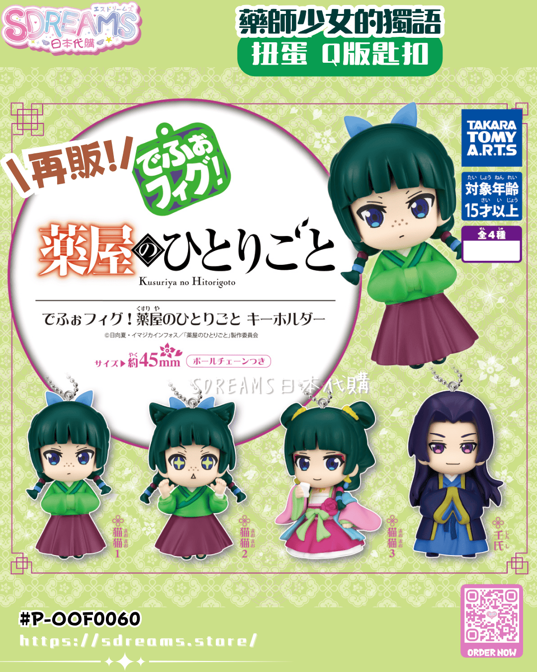 藥師少女的獨語 Q版 扭蛋 匙扣 Figure (全4款) "The Pharmacist's Monologue" Defofig! Key Holder Figure (4 Types) ・猫猫1 ・猫猫2 ・猫猫3 ・壬氏 SIZE:approx. H50mm 製造商Manufacturer:Takara Tomy Arts 截單截數日 DEADLINE:2025/11/07 預定發售月 RELEASE:2025/06 預定到貨月 AVAILABLE:2026/04 #藥師少女的獨語