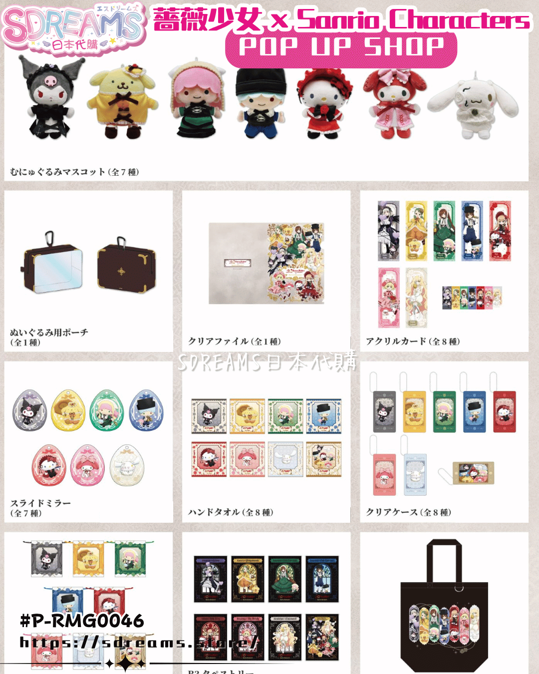 "Rozen Maiden" × Sanrio Characters POP UP SHOP Mascot Plush Doll / Pouch / Clear File / Acrylic Card / Slide Mirror / Hand Towel / Clear Case / Drawstring Bag / B3 Tapestry / Tote Bag .軟綿綿毛公仔掛飾 .公仔用痛包 .A4 File .亞加力卡(全8種) .滑動隨身鏡 .手巾 .透明小物包 .索繩袋 .B3掛畫 .TOTE BAG(手提袋) 製造商Manufacturer:medicos 截單截數日 DEADLINE:2025/11/27 日本預定發售月 RELEASE:2025/11 #RozenMaiden #薔薇少女
