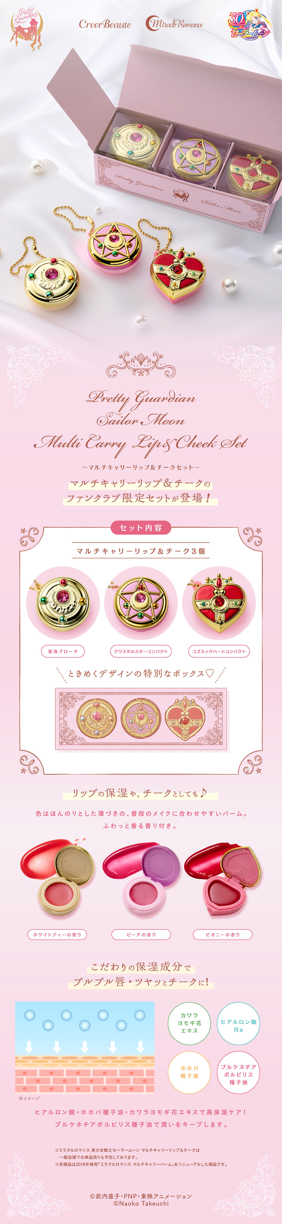 "Sailor Moon" Multi Carry Lips & Cheek 美戰再度推出「變身器造型」多用途唇彩胭脂! 3款香味選擇,添加保濕成分,質地輕薄好推,輕鬆打造百搭妝感。 套裝版為 FC 限定,配特別設計外盒,收藏必入! ・Transformation Brooch 變身胸針(白茶香 White Tea Scent):H21×W39×D38mm ・Crystal Star Compact R代胸針(桃香 Peach Scent):H21×W39×D38mm ・Cosmic Heart Compact S代胸針(牡丹香 Peony Scent):H21×W38×D42mm ・Ball Chain:直徑約38mm SIZE:approx. H21 × W38~39 × D38~42mm 製造商Manufacturer:BANDAI 截單截數日 DEADLINE:2025/12/19 日本預定發售月 RELEASE:2026/08 #美少女戰士 #SailorMoon