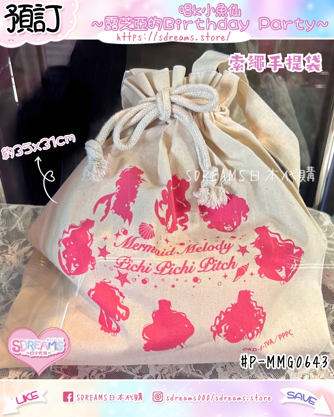 唱k小魚仙 露芝亞的 Birthday Party 索繩袋環保袋 SIZE:approx. H350 × W310 × D80mm 製造商Manufacturer:BANDAI NAMCO 截單截數日 DEADLINE:2025/07/13 預定發售月 RELEASE:2025/07 預定到貨月 AVAILABLE:2025/08 #真珠美人魚 #唱k小魚仙 #PichiPichiPitch