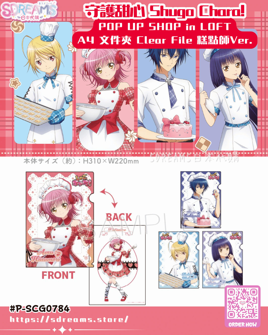 "Shugo Chara!" POP UP SHOP in LOFT Clear File Pastry Chef Ver. (全4款) SIZE:approx. H310 × W220mm 製造商Manufacturer:TAPIOCA 截單截數日 DEADLINE:2026/01/06 日本預定發售月 RELEASE:2026/01 #守護甜心 #ShugoChara