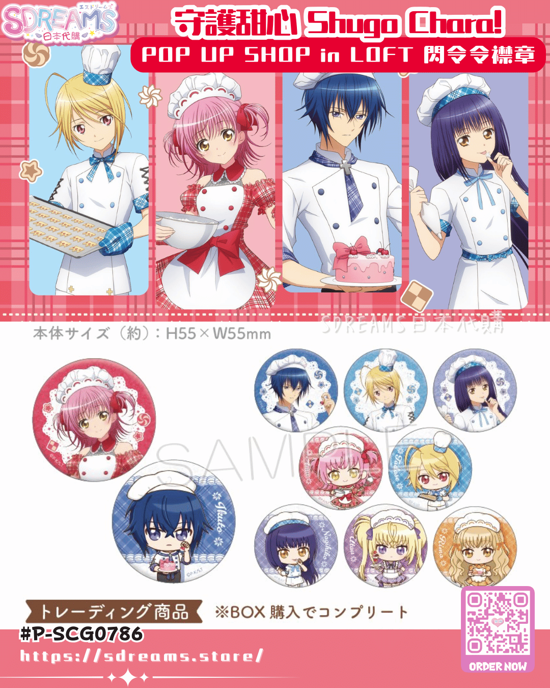 "Shugo Chara!" POP UP SHOP in LOFT Rame Can Badge (全10款) SIZE:approx. 55Φmm 製造商Manufacturer:TAPIOCA 截單截數日 DEADLINE:2026/01/06 日本預定發售月 RELEASE:2026/01 #守護甜心 #ShugoChara